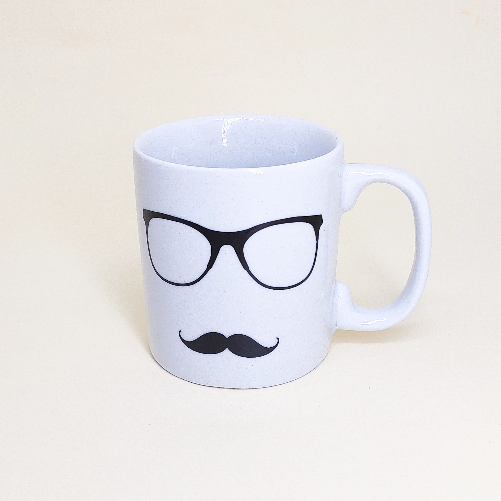 Caneca em porcelana branca com desenho de Oculos e Bigode.