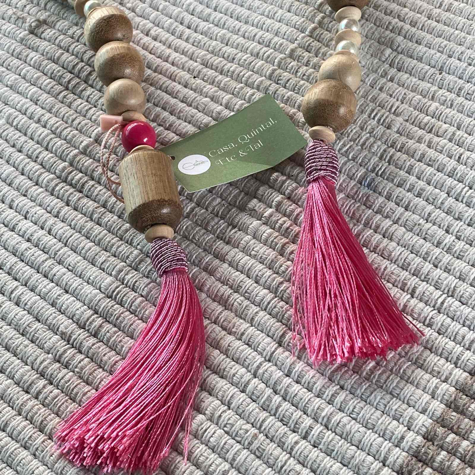 Os colares são feitos e cordões elásticos, miçangas em madeira natural e acabamentos modernos variando entre franjas e/ou pingentes.