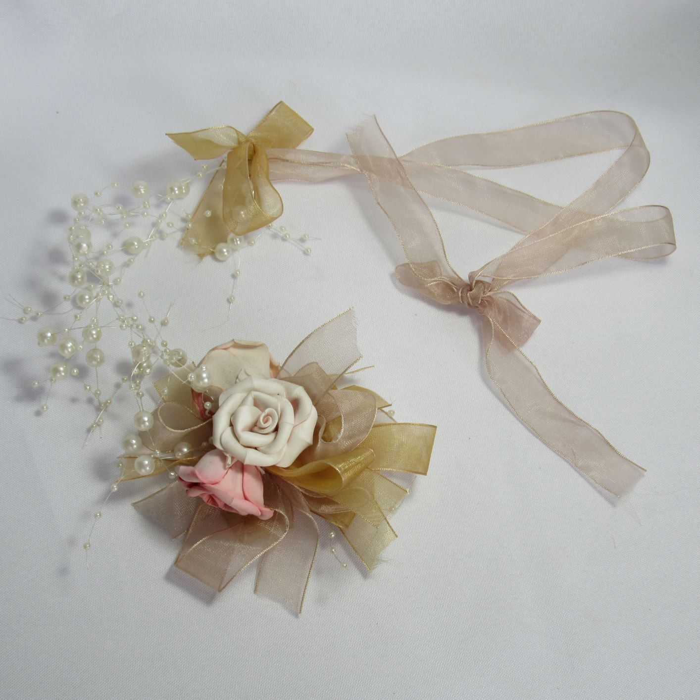 Flores artificiais, fitas e pérolas formam o encanto desse lindo móbile.